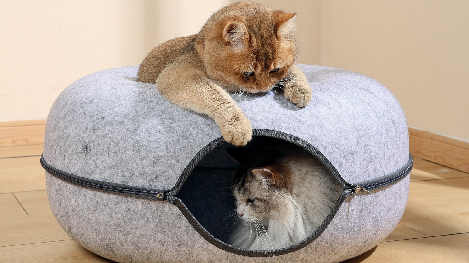 M-PETS® Solution: Choose from our various cat baskets, tunnels, and hideaways, which combine comfort with thoughtful design. The M-PETS Cozy Tunnel offers warmth and privacy, while beds with raised edges provide a sense of security.